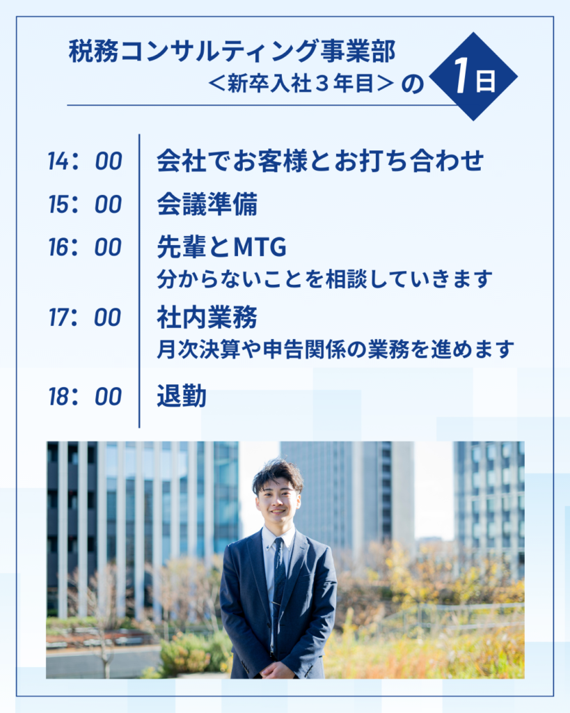 税務コンサルティング事業部社員〈新卒入社3年目〉の1日の流れをご紹介いたします!