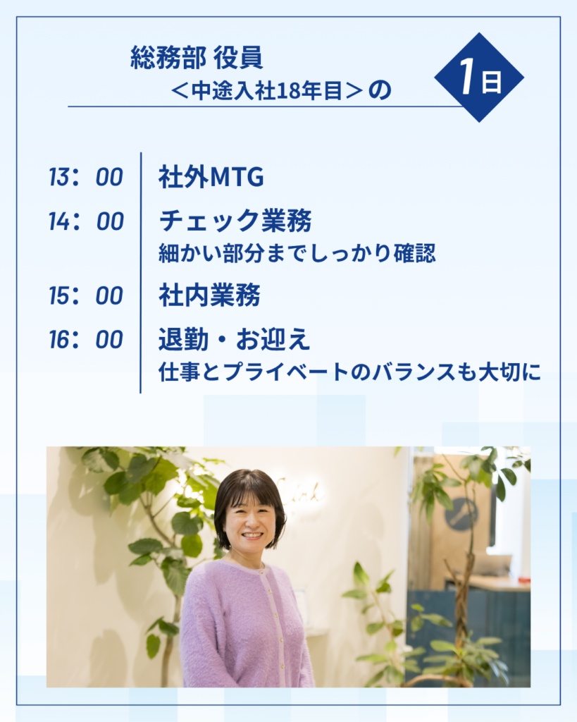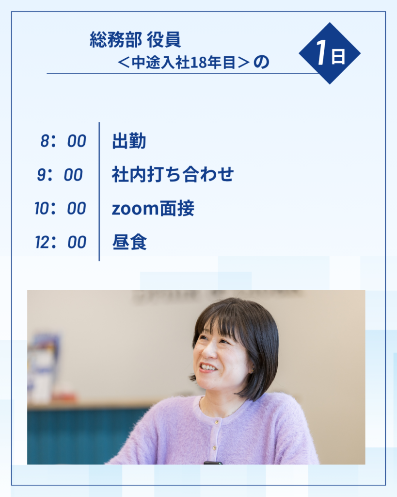 今回は、総務部役員〈中途入社18年目〉1日の流れをご紹介をご紹介いたします!
